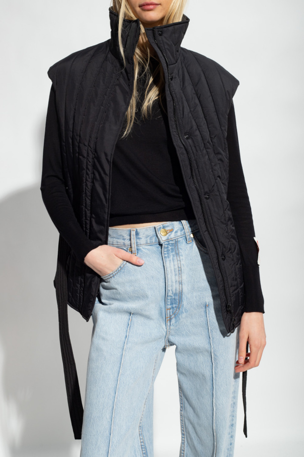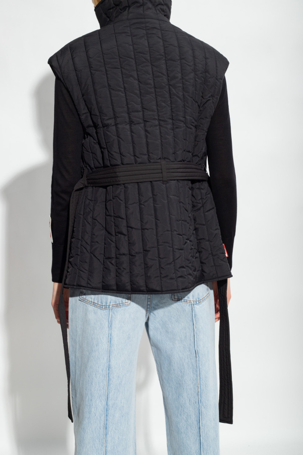 Black insulated vest from Hunter. Made of quilted fabric, this design features a zip and snap buttons, stand collar, self-tie belt and two snap-fastened front pockets.