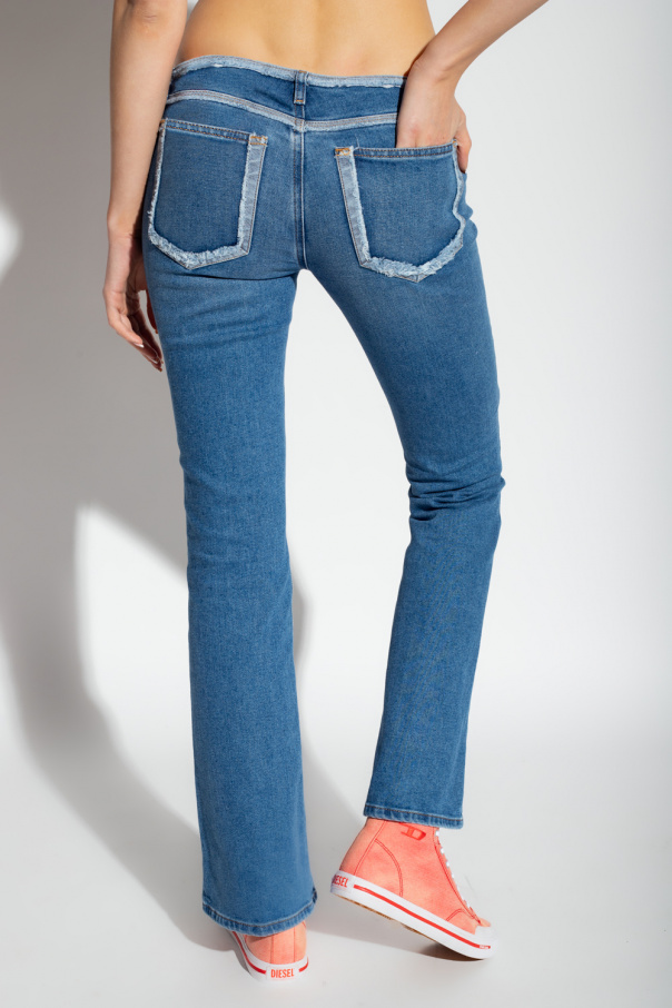 Blue ‘1969 D-EBBEY’ slim fit jeans from Diesel. This low rise pair features a zip and hook closure, logo patch, three front pockets, two back pockets, flared legs and a vintage effect.