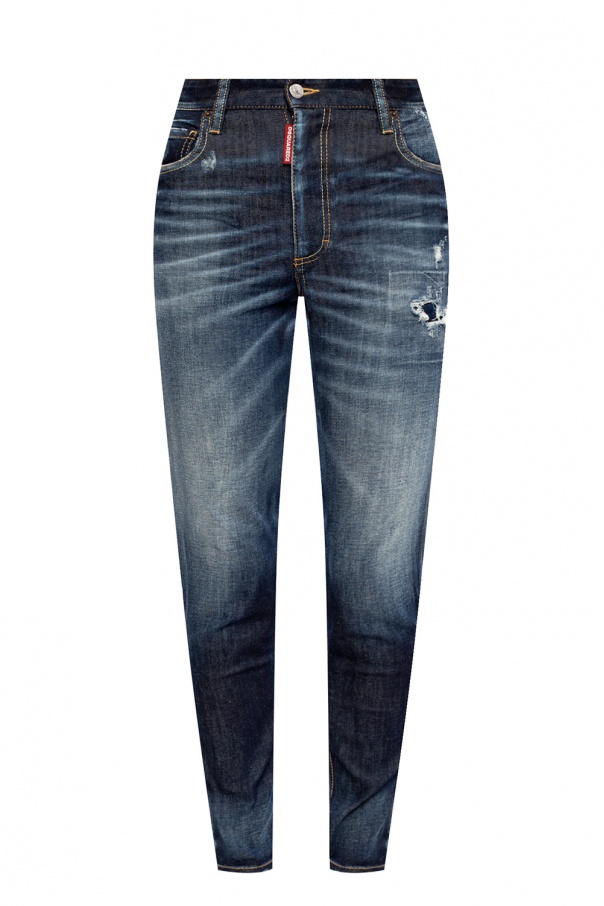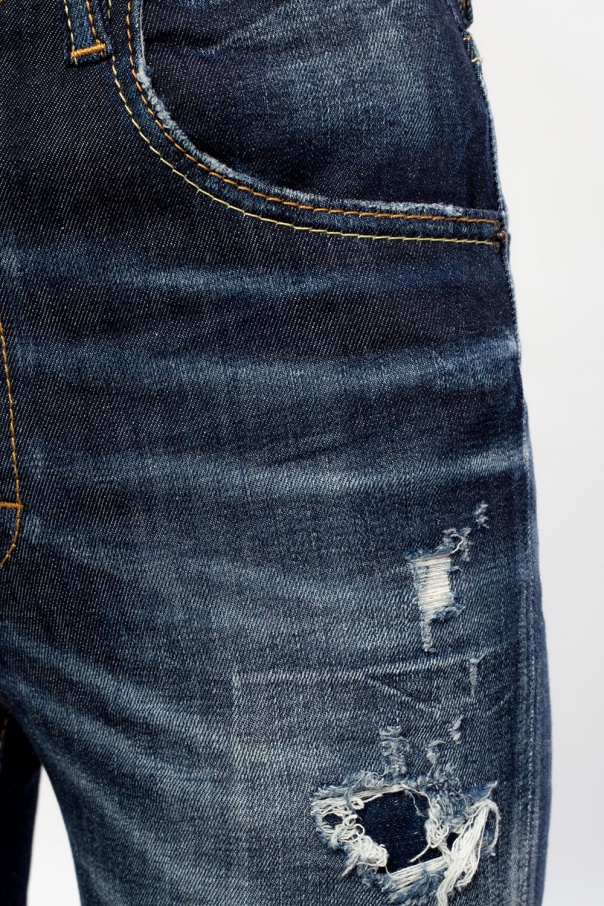 Light blue ‘Twiggy Jean’ jeans from Dsquared2. This raw edge design features button fastenings, logo details, yellow stitching details, sewn-in zips, three slip pockets on the front and two at the back.
