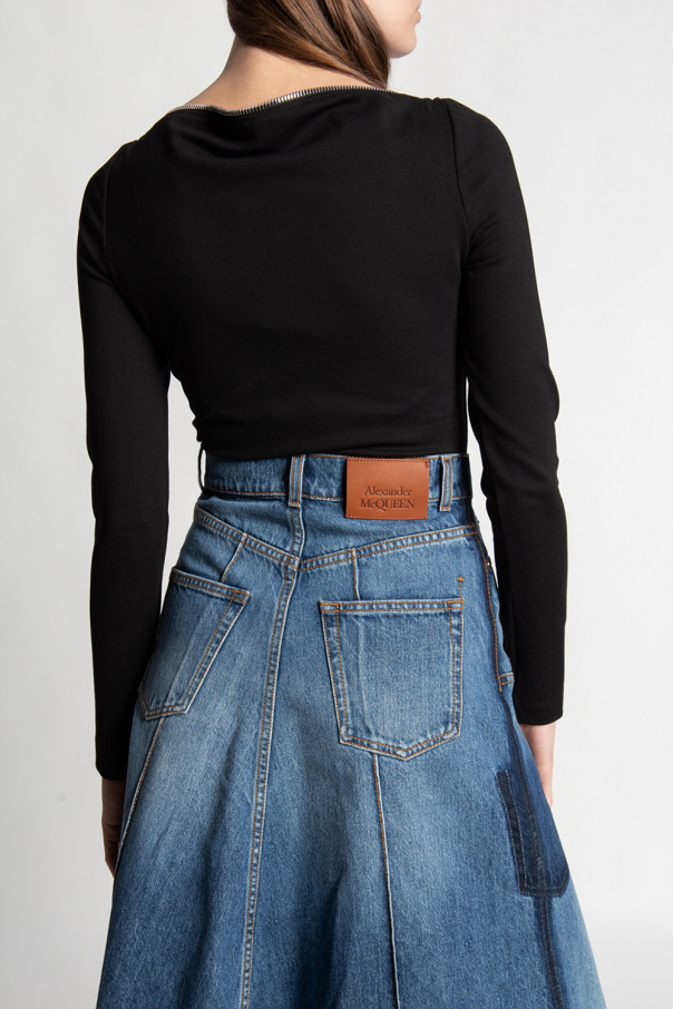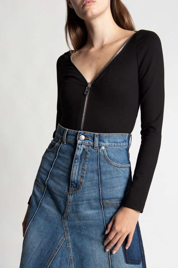 Black bodysuit from Alexander McQueen. Crafted from a stretch fabric blend, this style showcases a V-shaped neckline accentuated with a zipper, double snap closures at the crotch and silver-tone metal hardware.