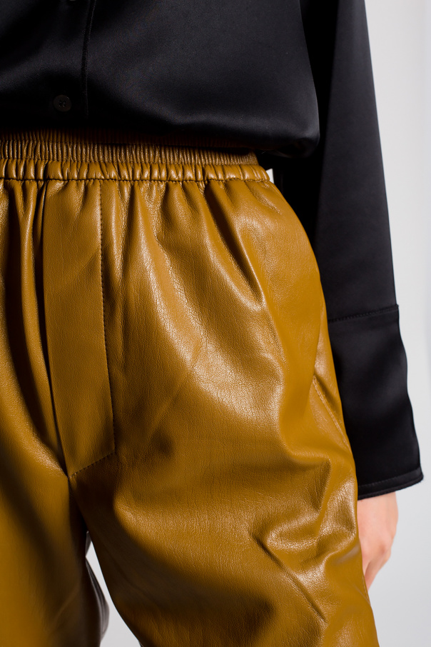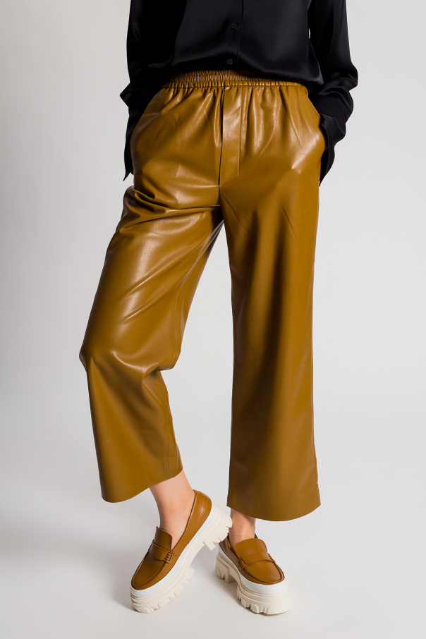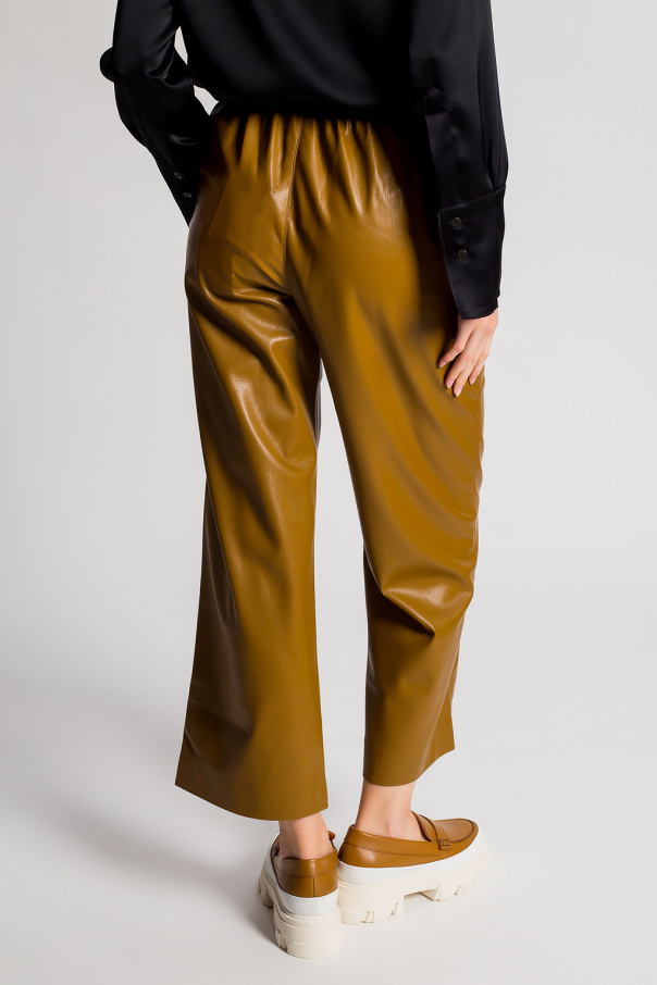 Brown trousers from Nanushka. Made of vegan leather, this pair falls down with straight wide legs and is complete with an elastic waistband and two slip pockets.