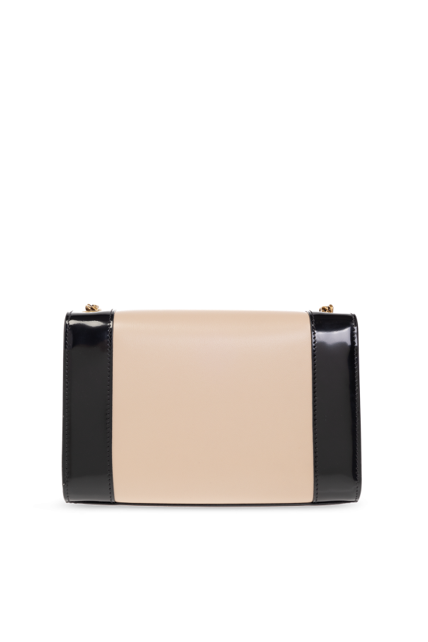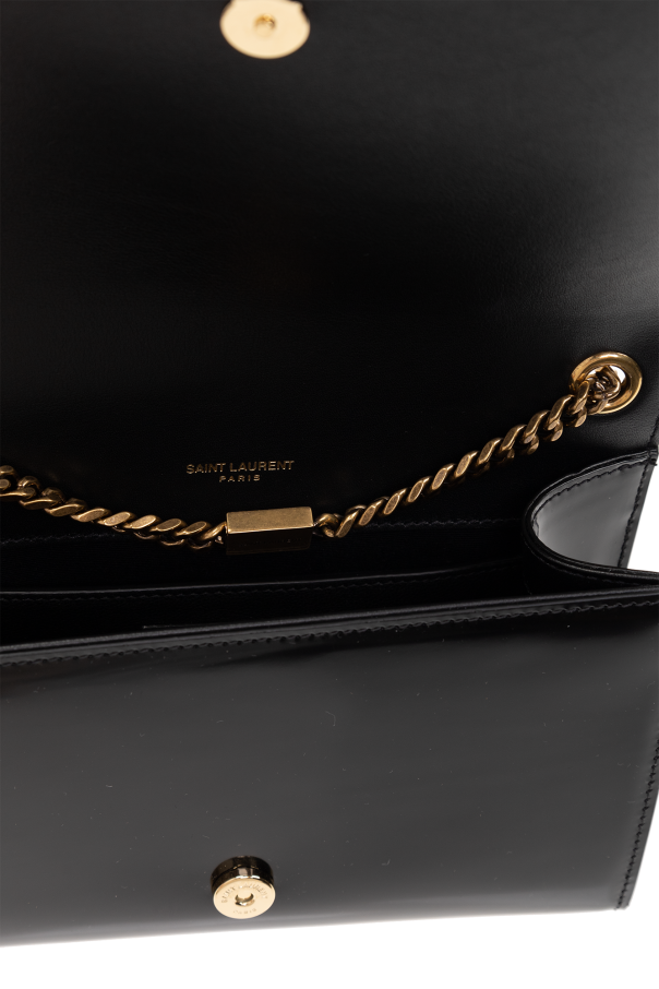 Black and beige ‘Kate Small’ shoulder bag from Saint Laurent. Made of smooth and patent leather, this model features a magnetic snap, metal logo detail, gold-tone metal hardware and one internal compartment with one slip pocket.