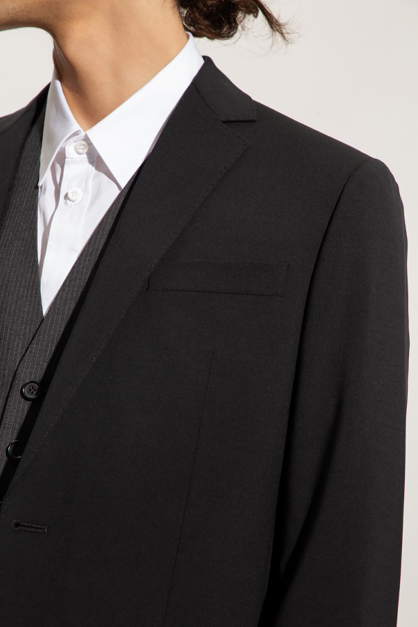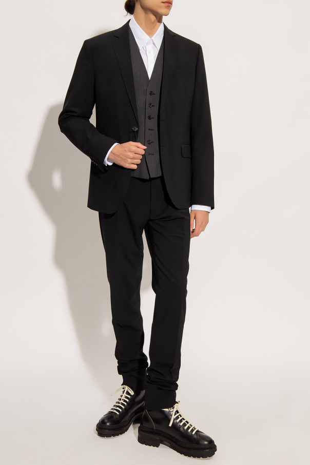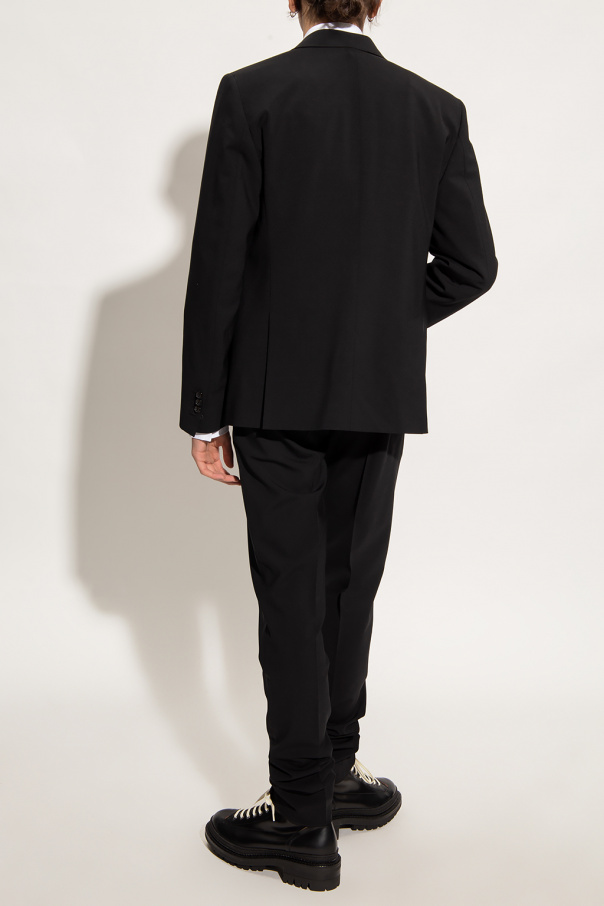 Black suit from Dsquared2. Made of wool, this ensemble includes a blazer with notch lapels, button fastenings, distinctive topstitching details, one welt pocket, two flapped pockets, long sleeves, a double back vent and a white lining woven with a monogram pattern, and trousers with slightly tapered legs, a zip fly with a button and a hook, two side seam pockets and two back button pockets.