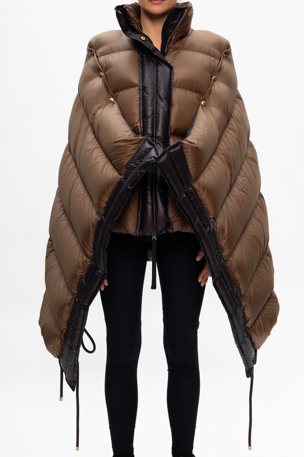 Brown and black quilted poncho from Moncler Genius, ‘1952 no. 2’ collection. Packed with goose down, this item features zip and snap fastenings, grosgrain strap with a logo at the back and decorative drawstring at the hem.