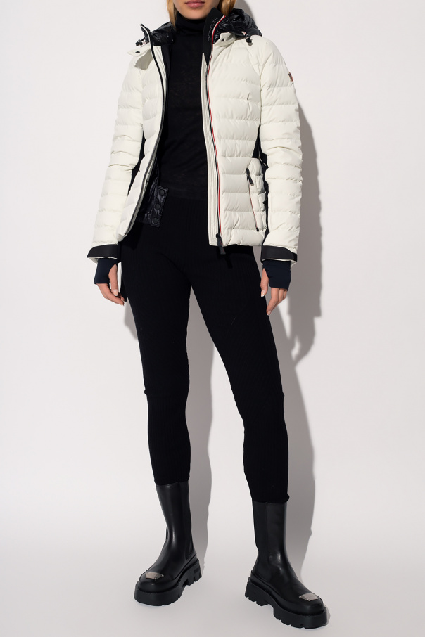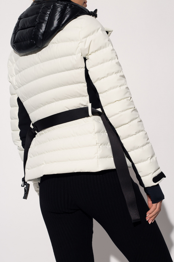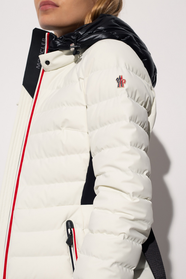 White, black and red ‘Bruche’ quilted ski jacket from Moncler Grenoble. Filled with goose down, this style fastens via a two-way zipper and a snap and features a waist-cinching belt, a cream, navy blue and red logo patch, three zipped pockets, a drawstring hood and long sleeves with thumbholes and velcro closures.