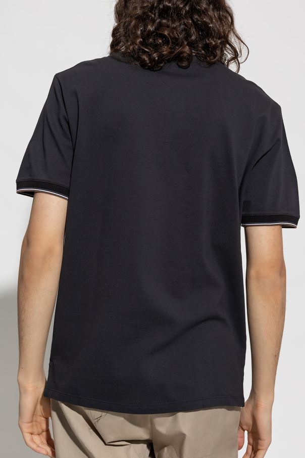 Black polo shirt from Emporio Armani. Made of cotton, this short sleeve design features a buttoned collar, white logo embroidery and decorative stripes.