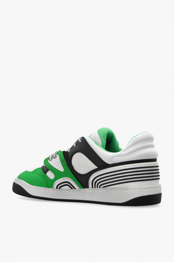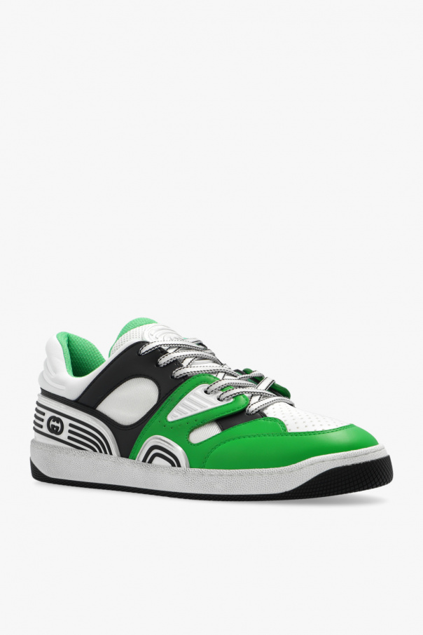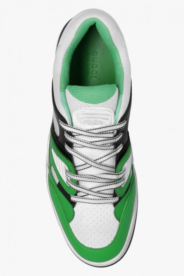 White, green and black ‘Basket’ sneakers from Gucci. Crafted form faux leather, this lace-up pair features perforations, logo pattern and black rubber sole.