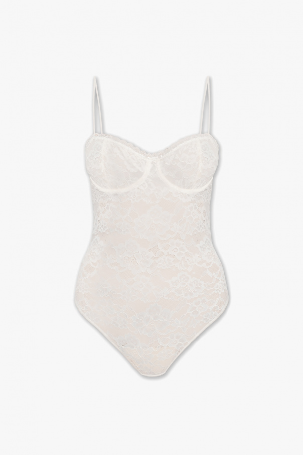 Cream bodysuit from Oseree. Rendered in lace, this style features underwires, adjustable spaghetti straps, a triple hook & eye fastening at the crotch and removable padded cups.