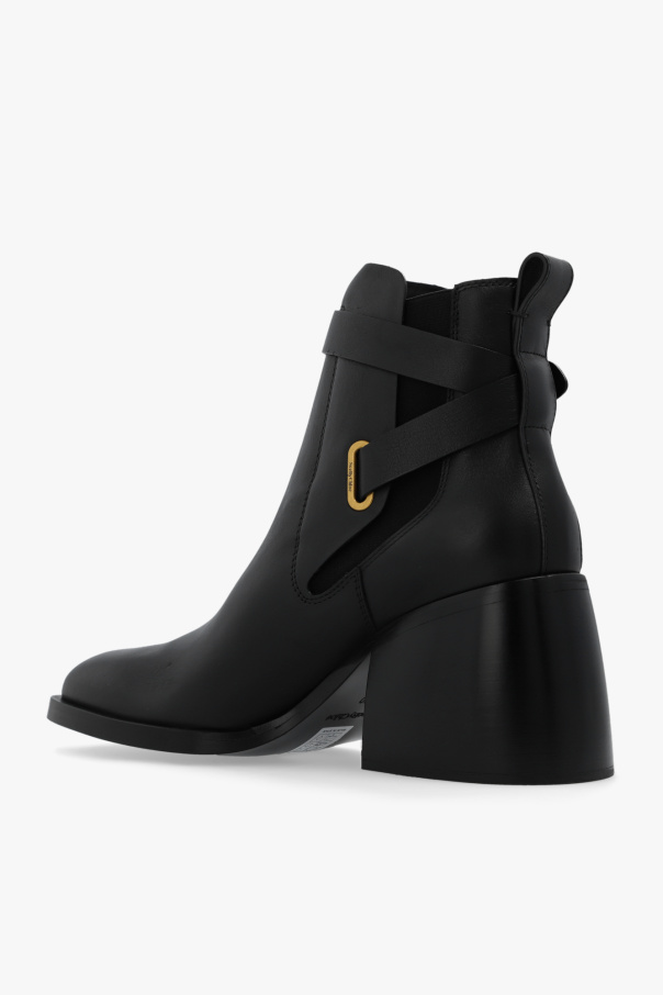 Black ‘Averi’ heeled ankle boots from See By Chloe. Made of leather with an almond-shaped toe, this model sits on a black rubber sole and features an adjustable strap with a gold-tone buckle and elastic panels on the sides.