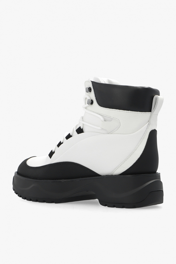 White and black ‘Dupree Hiker’ ankle boots from Michael Michael Kors. Crafted from fabric and trimmed with rubber, this lace-up model features tactile branding on the side and a black rubber sole at the base.