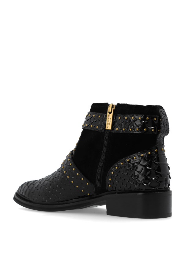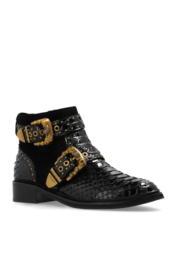 Introducing the epitome of sophistication and refined style - the Kurt Geiger London Ankle Boots. These luxurious women\'s boots are meticulously crafted from premium black leather with a striking snakeskin texture, exuding an aura of elegance and modernity. Designed for the discerning fashionista, these ankle boots feature a rounded toe and a low, flat heel for an effortlessly chic look. Adorned with small, golden studs across the surface and complemented by opulent golden buckles, these boots make a bold statement. The addition of sumptuous suede accents and a plush inner lining ensures comfort with every step. The practical yet ornamental golden zipper on the outer side enhances ease of wear, while the signature \"Kurt Geiger London\" logo graces the interior, a hallmark of exquisite craftsmanship. The dominant black hue, interspersed with luxurious golden details, makes these boots a versatile addition, perfect for pairing with jeans or more formal attire. Why Choose This Product? Exquisite design with premium black leather and snakeskin texture. Elegant golden stud and buckle embellishments. Comfortable suede accents and soft inner lining. Practical golden zipper for easy wear. Versatile style suitable for both casual and formal outfits.