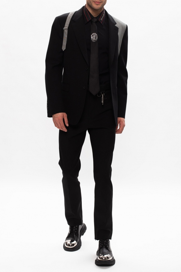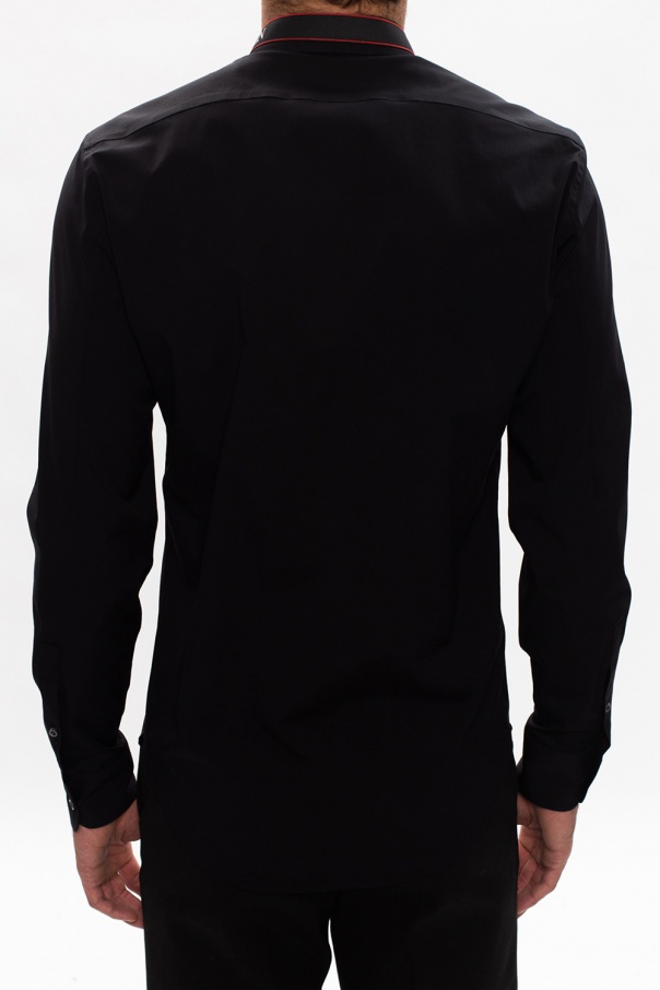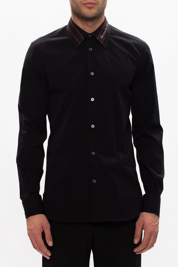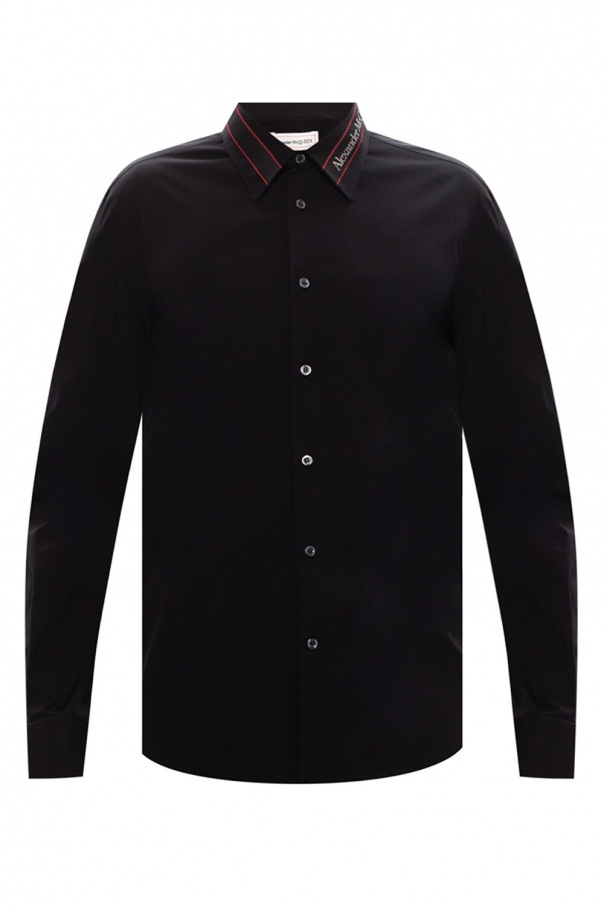Black shirt from Alexander McQueen. Crafted from cotton, this design features button fastening and sewn-on logo stripes in white and red.