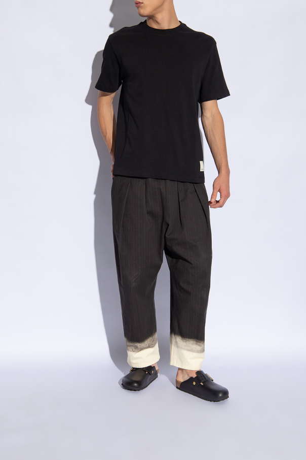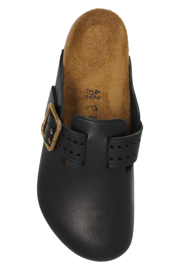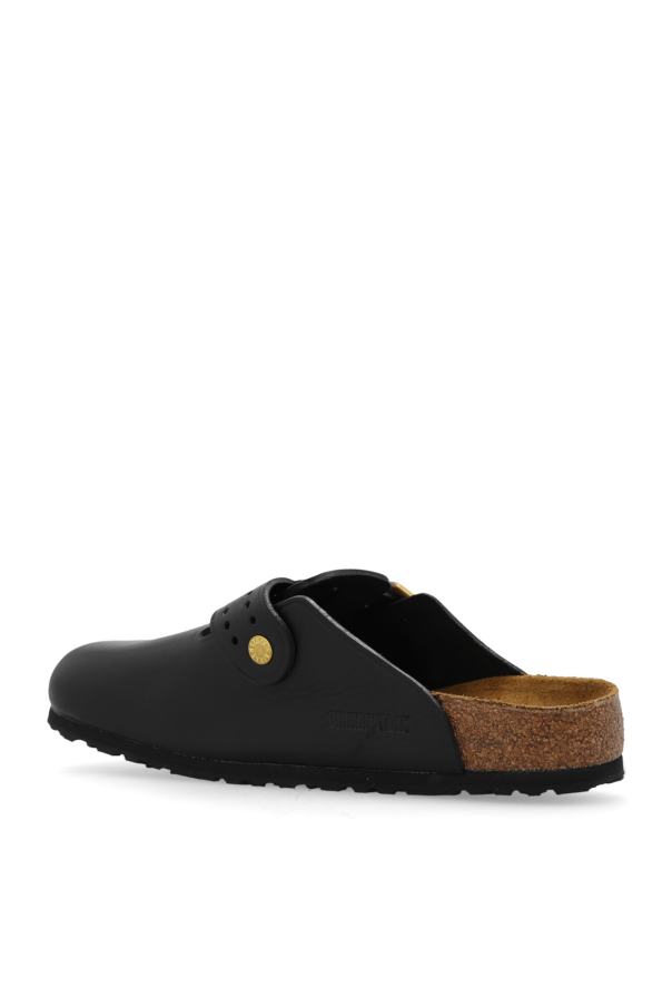 Black ‘Boston Bold Gap’ slides from Birkenstock. Made of leather, this pair features an adjustable perforated buckle strap, embossed logo on the side, anatomically shaped regular width cork-latex footbed and a black EVA outsole.