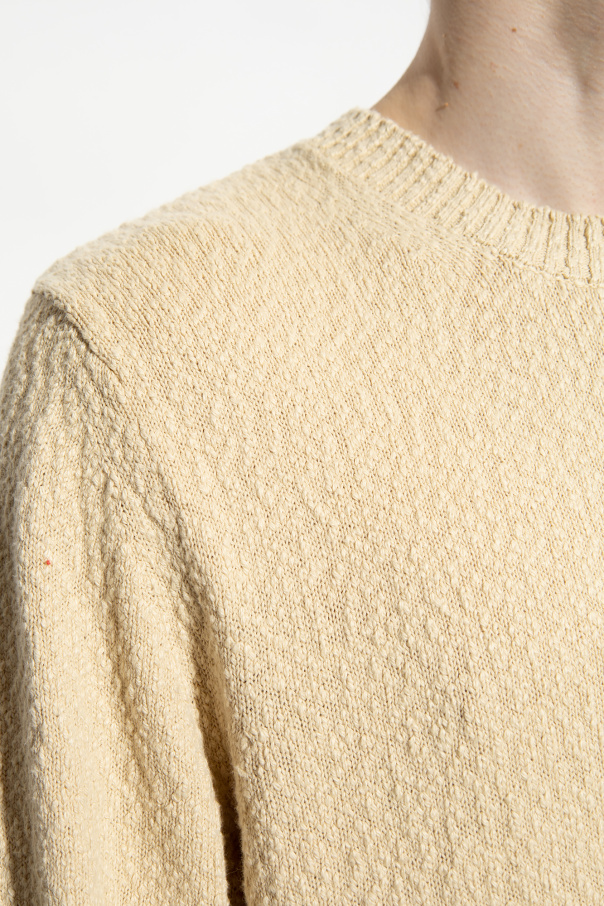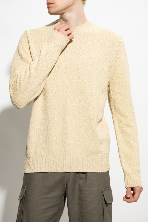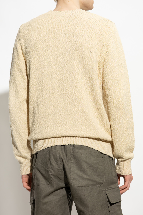 Beige ‘Ray’ crewneck sweater from Samsoe Samsoe. Crafted from textured cotton, this style features long sleeves and ribbing on the collar, bottom hem and cuffs.
