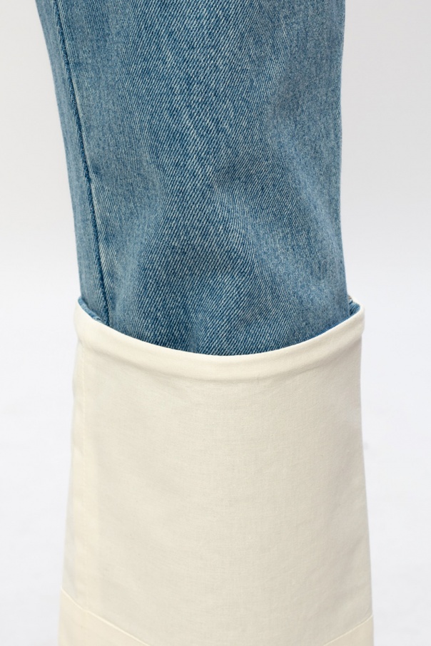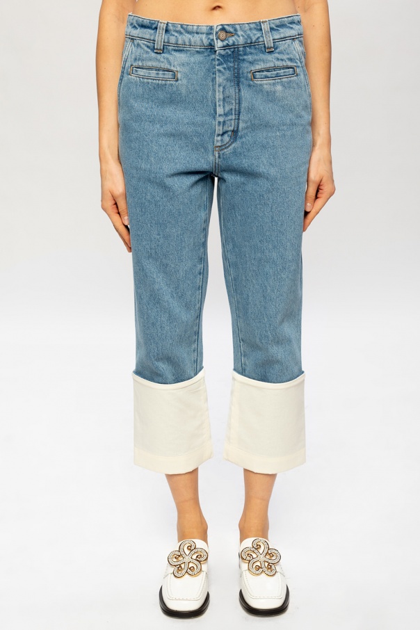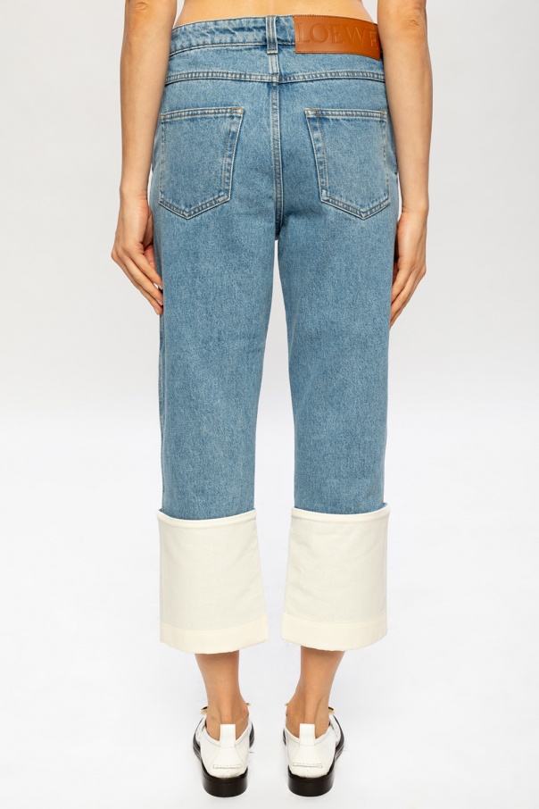Light blue jeans from Loewe. Cut from time-worn, stonewashed cotton denim, this pair fastens via buttons and showcases exposed contrasting orange stitching, a brown leather patch with embossed logo, cream turn-ups and six pockets throughout, including four front ones and two back ones.