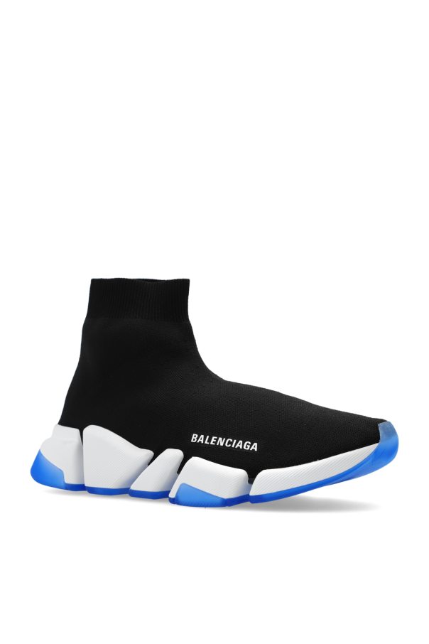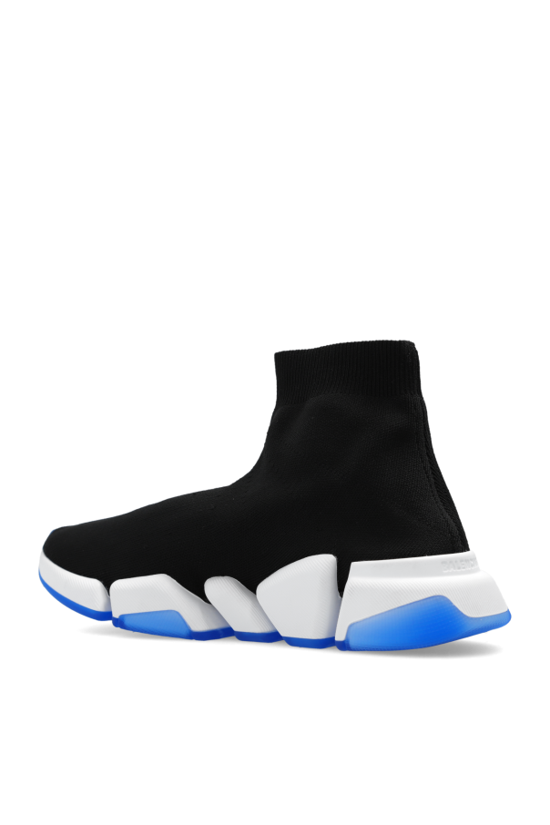 Black \'Speed 2.0\' sneakers from Balenciaga. Made from technical knit, this model sits on a blue rubber sole and showcases a printed white logo and a sock-like edge.