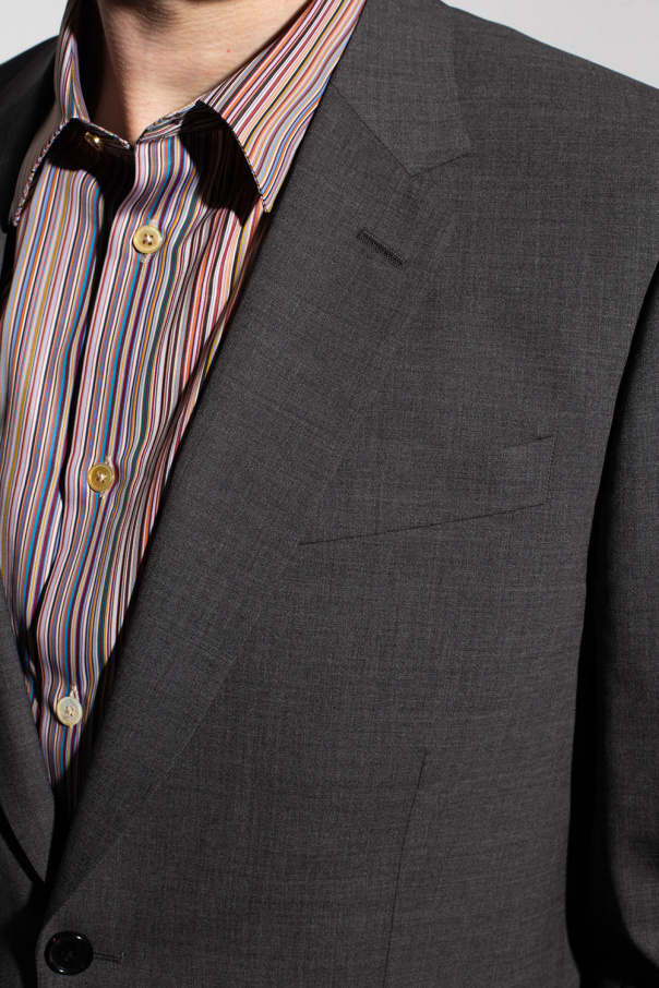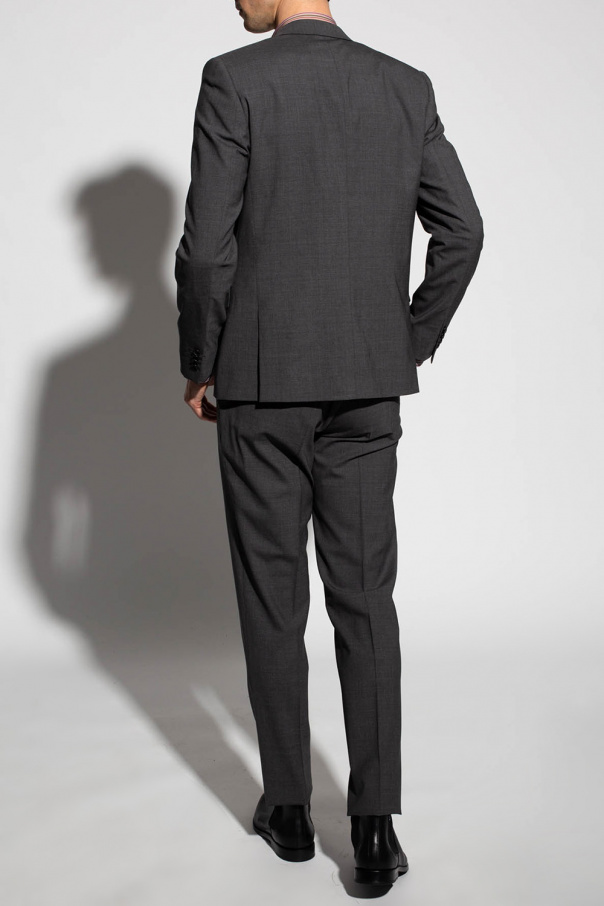 Grey suit from Paul Smith. Made of wool. Blazer fastens via two buttons and features notch lapels, blue lining, two flapped pockets on the front and a double vent at the back. Trousers fall down with tapered legs and feature a zip fly with a hook closure, two side seam pockets and two back button pockets.