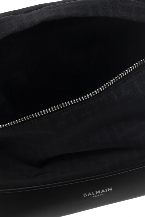 Black belt bag from Balmain. Embellished with the brand\'s logo and a monogram pattern, this design features two zipped pockets on the sides, an adjustable strap, silver-tone metal hardware and one internal compartment with a slip pocket.