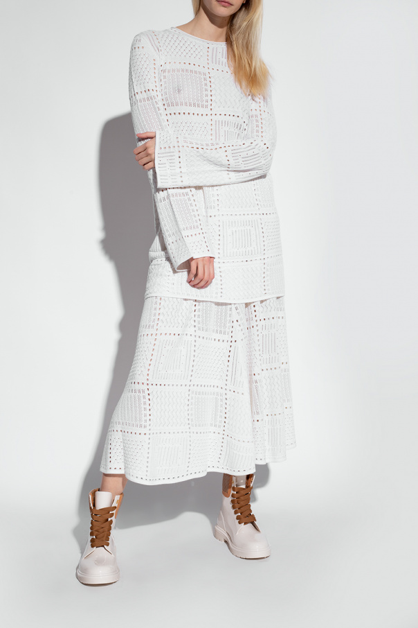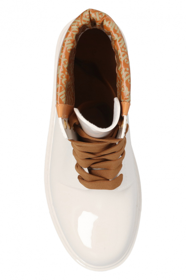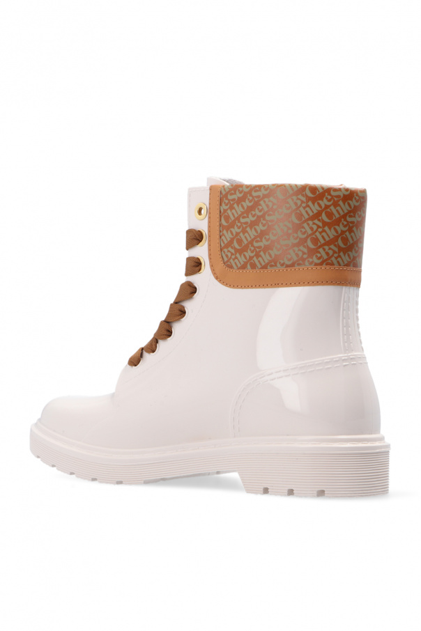 White ‘Florrie’ rain boots from See By Chloé. Sitting on a white rubber sole, this model features gold-tone metal hardware and a brown insert printed with a grey logo.