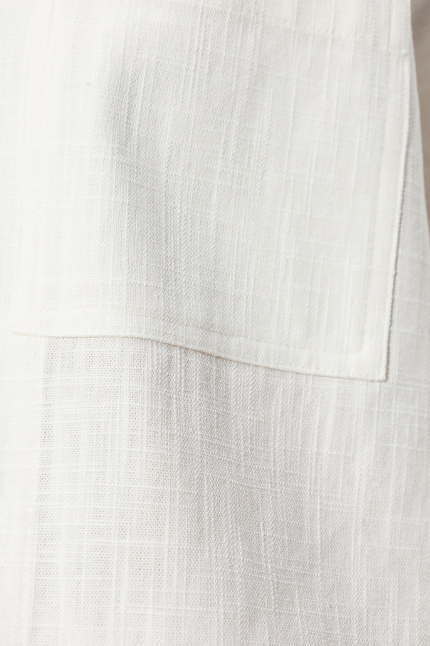 White shirt from Bottega Veneta. Made of textured cotton with a cropped fit, this style fastens with buttons and features a slip chest pocket and short sleeves.