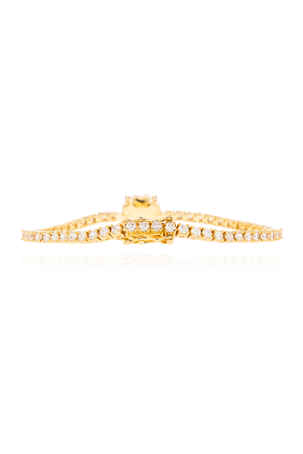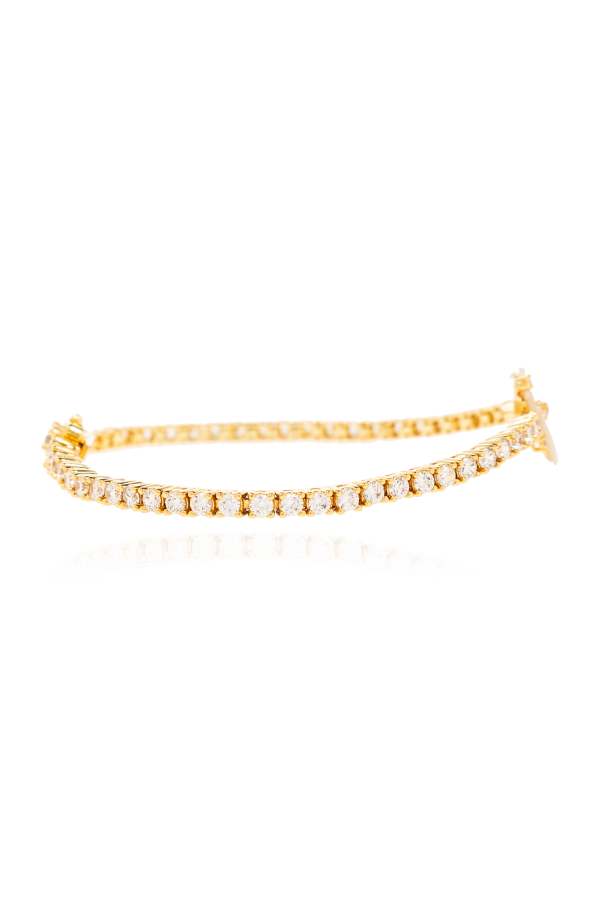 Yellow gold-tone bracelet from Kate Spade, the ‘Precious Pansy’ collection. This item fastens with a box-tongue closure with a security keeper closure and is encrusted with glistening crystals and a mother-of-pearl pansy appliqué.