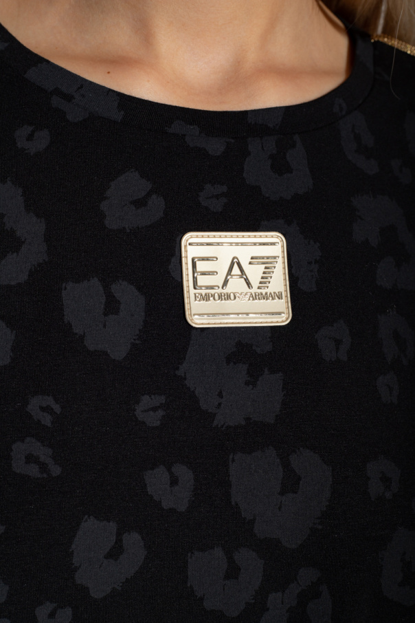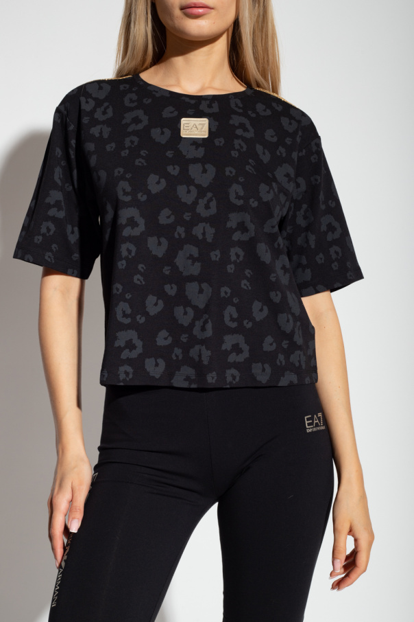 Black crewneck T-shirt from EA7 Emporio Armani. Crafted from a blend of organic cotton and modal, this style features short sleeves, an elasticated collar, a grey animal motif, a gold-tone logo patch on the front and glistening applications on the shoulders.