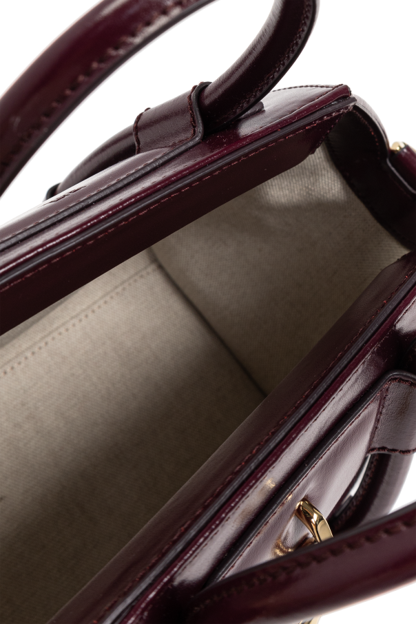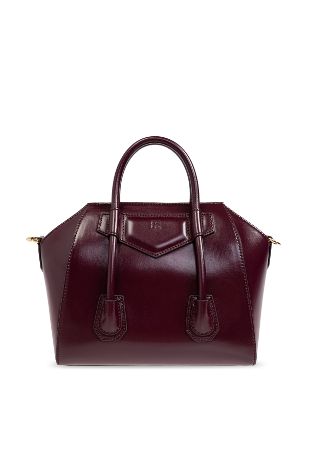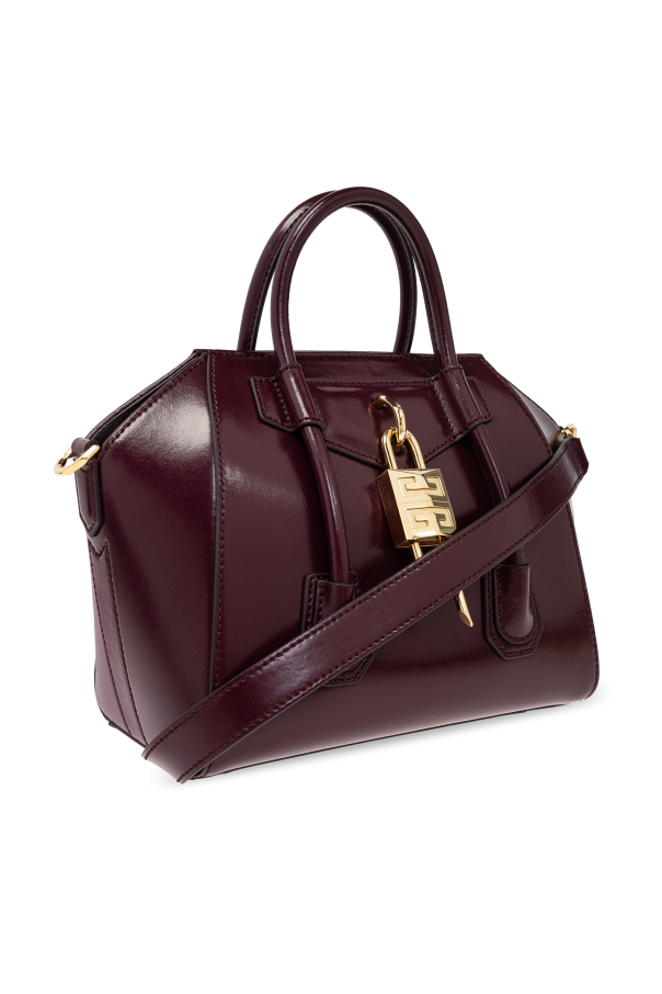 Introducing the Antigona Lock Mini shoulder bag, a masterpiece from the illustrious house of Givenchy. This exquisite accessory boasts a refined, geometric trapezoidal shape with subtly rounded edges, encapsulating timeless elegance. Crafted from the finest, glossy calfskin leather, the bag radiates luxury with its rich, deep burgundy hue. Its minimalist, monochromatic design is accentuated by the signature gold-toned lock engraved with the designer\'s emblem, exuding an air of sophistication. The Antigona Lock Mini features dual short handles for hand carry and a long, adjustable shoulder strap, enhancing its versatility. The interior is finished with a light-colored cotton lining, providing ease of access to your essentials. A secure gold zipper and an internal zippered pocket ensure your belongings are safe yet stylishly stored. Why Choose This Product? High-quality glossy calfskin leather Elegant burgundy color for a luxurious touch Distinctive gold emblem lock Versatile carry options with handles and a shoulder strap Practical and spacious interior with a zippered pocket Iconic design by the esteemed Givenchy