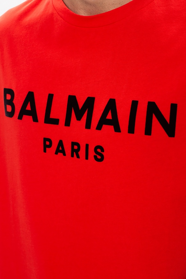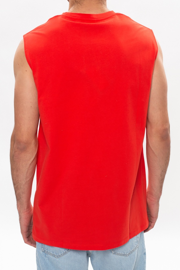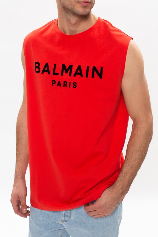 Red crewneck tank top from Balmain. Crafted from cotton, this sleeveless style boasts black graphic print with the brand's logo across the front.