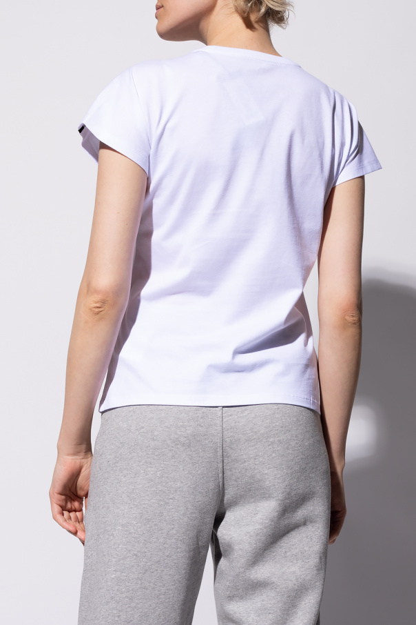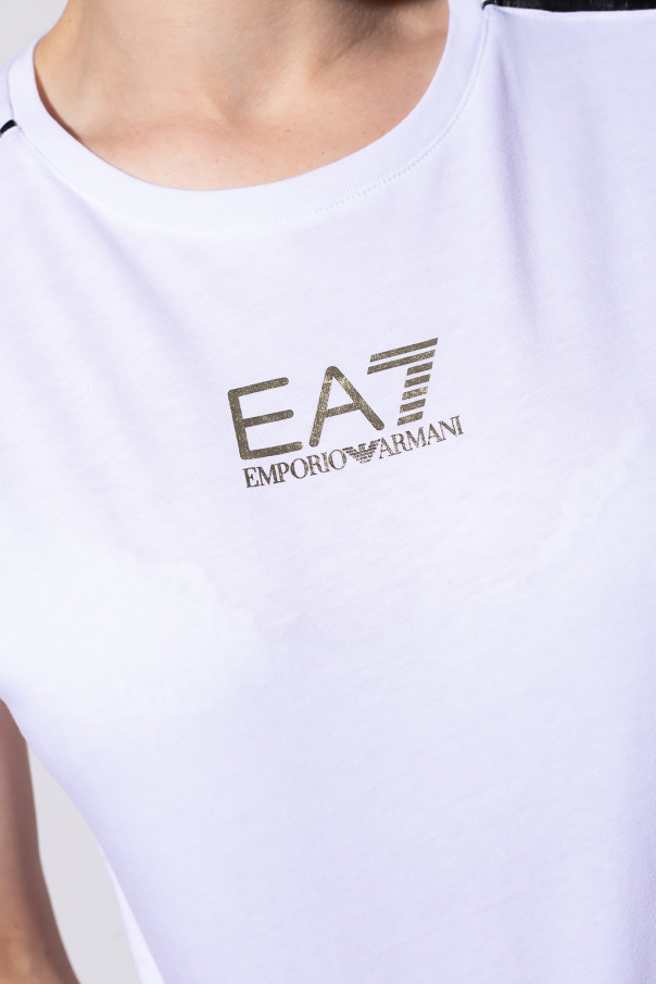 White crewneck T-shirt from EA7 Emporio Armani. Made of cotton, this short sleeve design features a printed logo pattern in gold-tone and black inserts at the shoulders.