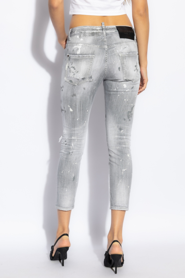 Introducing the \'Cool Girl\' jeans by Dsquared2, a masterpiece of contemporary fashion that effortlessly blends vintage charm with modern sophistication. Crafted from a premium blend of 98% cotton and 2% elastane, these jeans offer both comfort and a flattering fit that conforms to your silhouette, ensuring a look that\'s as comfortable as it is stylish. Boasting a unique grey hue with a vintage effect and localized bleaching, these jeans carry an aura of timeless elegance. The deliberate distressing and asymmetrical rips and tears along the legs infuse them with character and an edgy appeal, making each pair distinct. The cropped cut elegantly showcases the ankles, a nod to contemporary style trends, while the raw, unhemmed edges of the legs add a casual, laid-back vibe. Notable details include the iconic red brand patch on the back, signaling the jeans\' high-quality craftsmanship and brand prestige. The patinaed metal button and zipper closure lend an added touch of authenticity and durability. With a classic five-pocket design, these jeans combine functionality with fashion. Why Purchase the \'Cool Girl\' Jeans? Exquisite Material: High-quality blend for comfort and stretch. Unique Design: Vintage-inspired with modern distressed details. Stylish Cut: Cropped and tapered legs for a contemporary look. Brand Prestige: Signature red patch and high-quality metal hardware. Versatility: Perfect for both casual and elevated outfits.