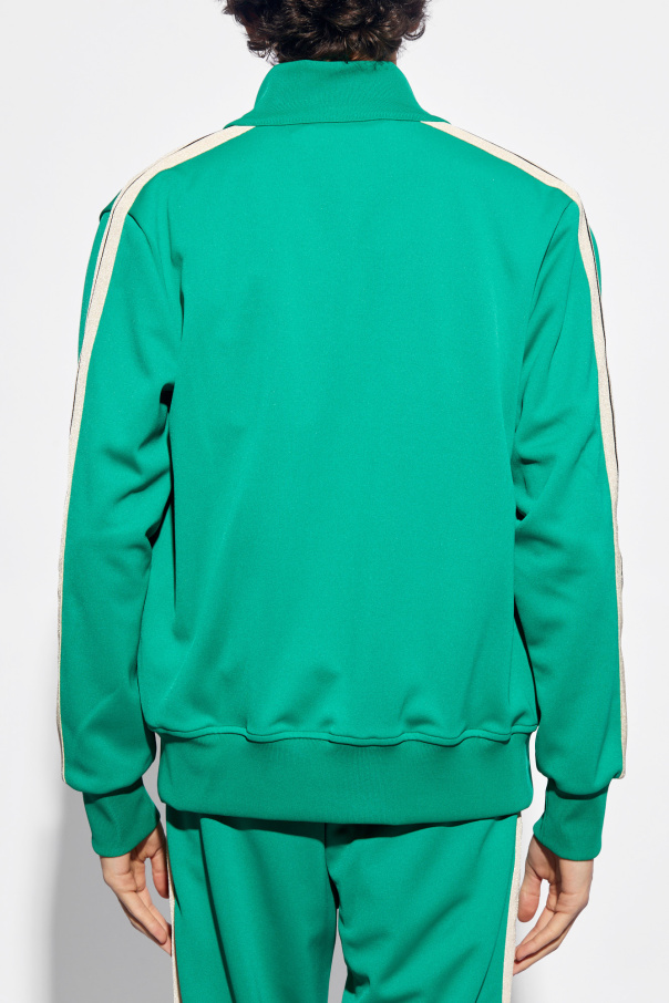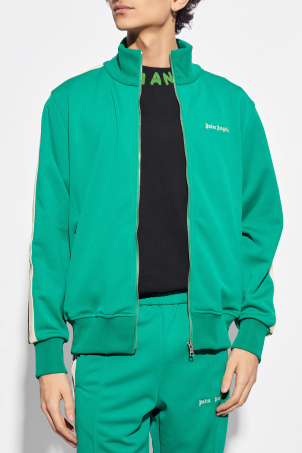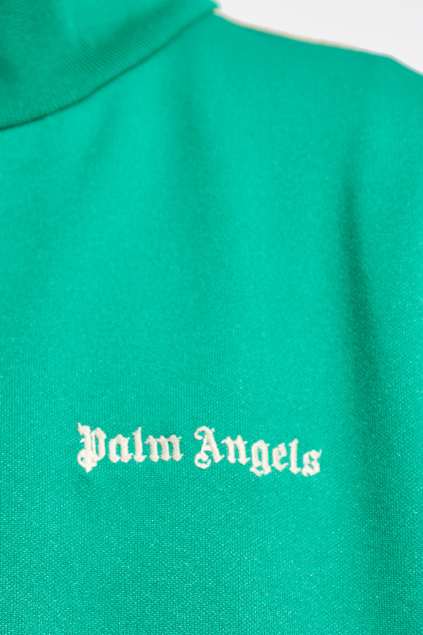 Green sweatshirt with a standing collar from Palm Angels. Embellished with white logo embroidery, this style features a zip fastening, two zip pockets, long sleeves and elasticized trims on the edges.