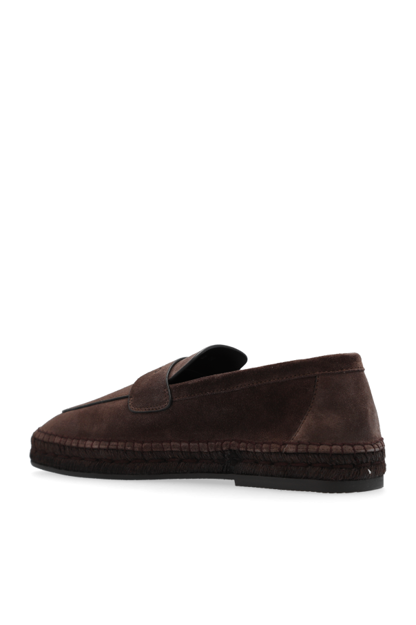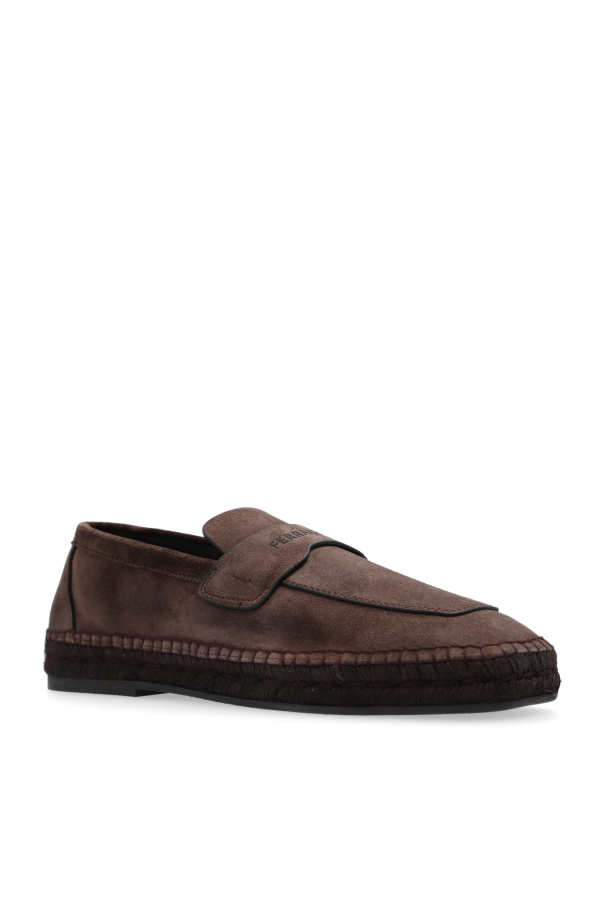 Introducing the pinnacle of refined leisure footwear - the ‘Desco’ Espadrilles by FERRAGAMO. Crafted with meticulous attention to detail, these moccasin-shaped espadrilles epitomize the fusion of classic elegance and contemporary comfort. The dominant rich brown hue, rendered in sumptuous suede, offers both versatility and a luxurious aesthetic appeal. The design is accentuated by a broad strap adorned with the distinguished FERRAGAMO logo, signaling its inclusion in an exclusive collection. Precision stitching around the shoe highlights the artisanal quality and dedication to excellence. The interior, darker in shade, is lined with soft calfskin and lambskin, ensuring utmost comfort for the wearer. A unique green, rubber sole, finished with jute, not only adds a distinctive touch but also provides enhanced grip, making these espadrilles as functional as they are stylish. Why purchase the ‘Desco’ Espadrilles? Exquisite Craftsmanship: Each pair showcases the artistry and quality synonymous with the FERRAGAMO name. Luxurious Materials: The use of premium suede, calfskin, and lambskin offers unparalleled comfort and durability. Versatile Design: The classic brown shade and elegant moccasin shape make these shoes a perfect match for a variety of outfits and occasions. Signature Details: The embossed FERRAGAMO logo and unique sole design set these espadrilles apart as a symbol of luxury and exclusivity.