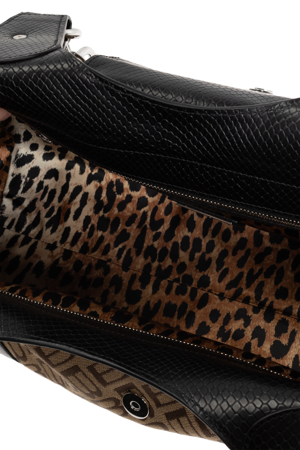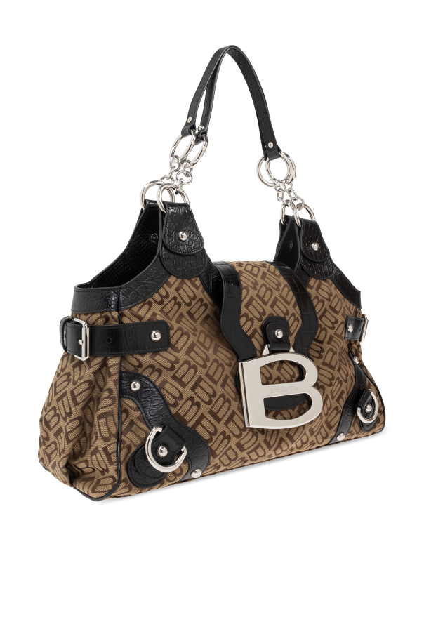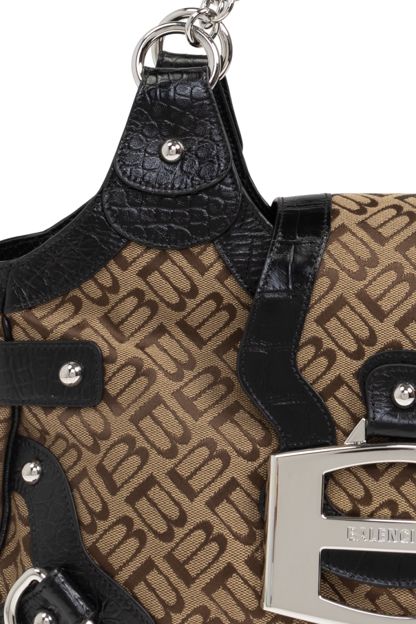Introducing the Essex Medium Shoulder Bag by the illustrious Balenciaga, a testament to exquisite craftsmanship infused with modern sophistication. This rectangular shopper bag, adorned with gently rounded edges, is quintessentially designed for those who appreciate both elegance and functionality. Crafted from a robust brown material emblazoned with the iconic \"B\" motif in a lighter hue, the exterior exudes timeless elegance. A prominent metal logo, shaped as a \"B,\" graces the front, complemented by black leather straps and handles, which impart a striking contrast. The silver-tone metal buckles and fittings add a touch of contemporary allure. The interior is luxuriously lined with an animal print fabric, embodying a sense of opulence. Equipped with two sturdy handles, the bag offers versatile carrying options, whether on the shoulder or in hand. A zip and magnetic snap closure ensure the security of your essentials, while the inner compartment and zippered pocket enhance its practicality. Why Choose This Product? Iconic design by Balenciaga, a fusion of heritage and modern trends. Spacious and practical shopper style for everyday use. Luxurious animal print lining for a touch of sophistication. Secure zip and magnetic snap closure for peace of mind. Distinctive aesthetic with contrasting leather details.