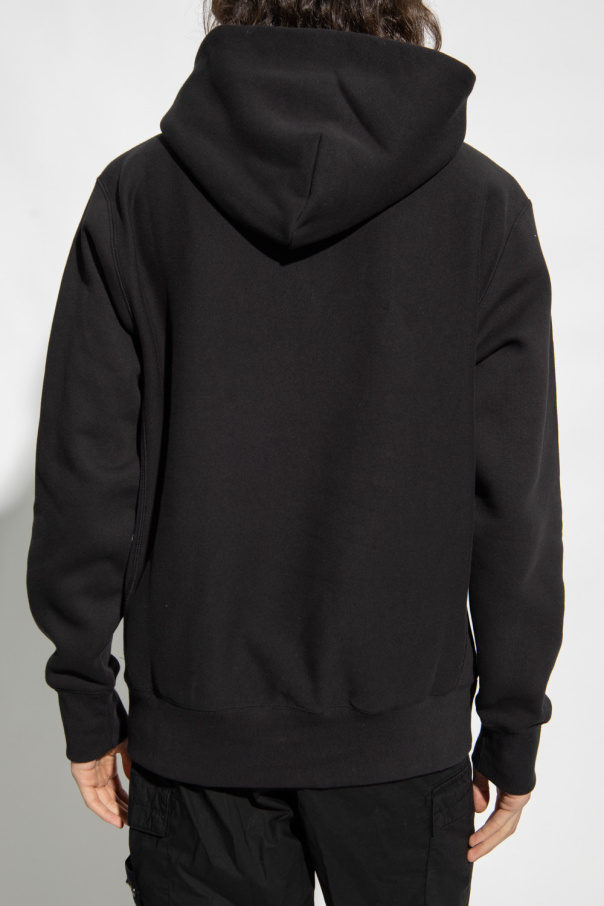 Black hoodie from Champion. Crafted from a cotton blend, this garment features a drawstring hood, sleeve patch with a logo, front pocket and ribbed trims at the hem and cuffs.
