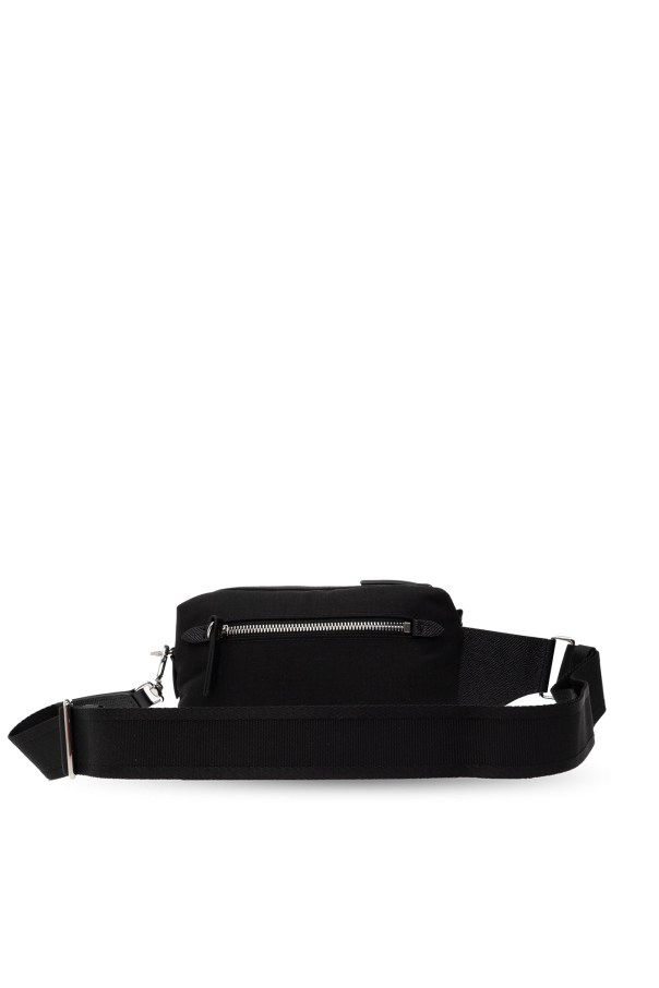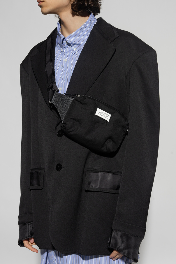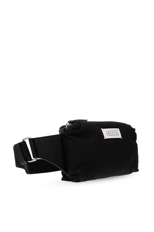 Black ‘Glam Slam’ belt bag from Maison Margiela. Crafted from fabric and trimmed with leather, this design secures with a zip and showcases the brand\'s signature white logo patch on the front. It is complete with an adjustable shoulder strap, one back zip pocket, silver-tone metal hardware and one internal compartment with a slip pocket.