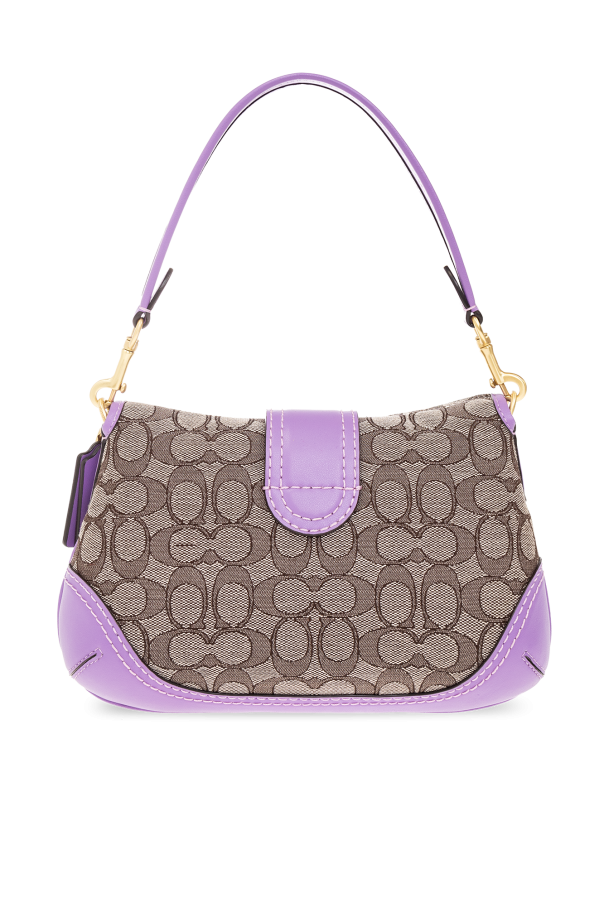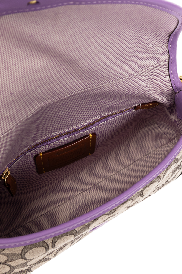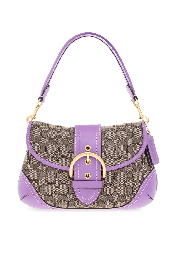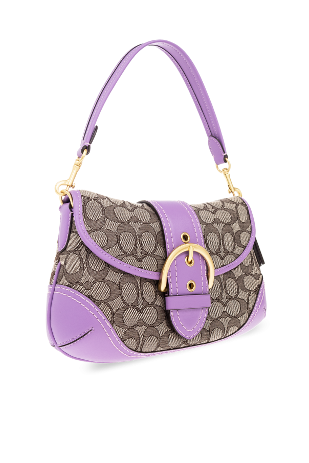 Purple and beige ‘Soho’ shoulder bag from Coach. Crafted from leather and canvas with a jacquard monogram pattern, this model features a flap with a magnetic snap, decorative buckle belt, detachable half-round handle, gold-tone metal hardware and one internal compartment with one zip pocket.