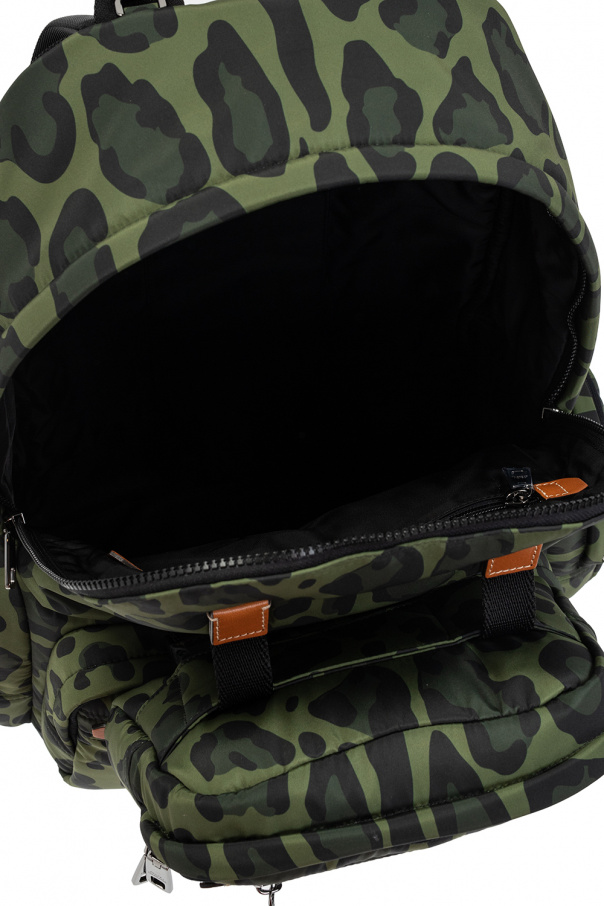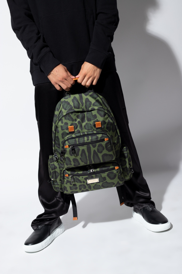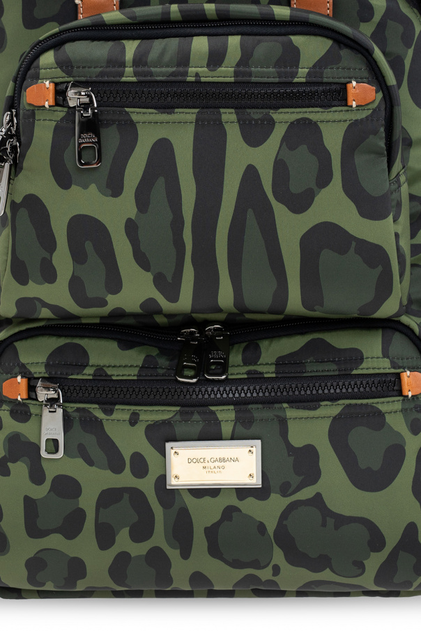 Green and black backpack from Dolce & Gabbana. Embellished with an all-over animal motif, this design fastens via a two-way zip and showcases a silver-tone metal plate with an engraved logo on the front, two zipped pockets, a detachable pouch with two zip pockets, side pockets with two-way zippers, adjustable shoulder straps, a half-round top handle, silver-tone metal hardware and one internal compartment with two slip pockets and one zip pocket.