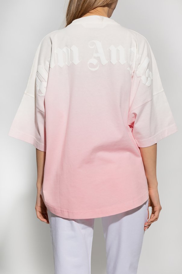 Pink and white crewneck T-shirt from Palm Angels. Crafted with a gradient effect, this style features a textured logo, short sleeves and ribbed trims.