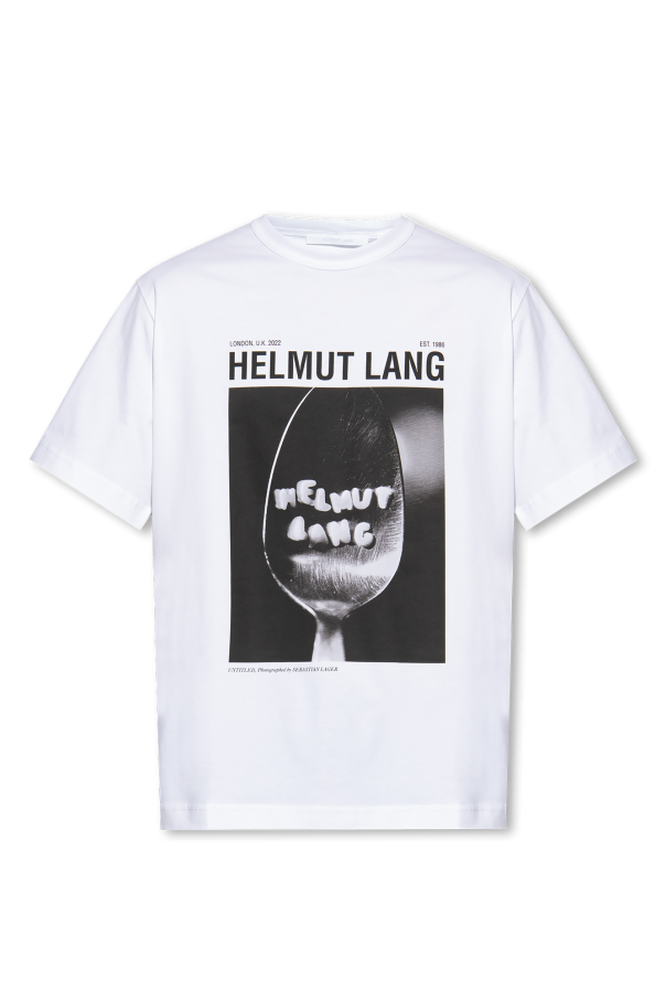White T-shirt from Helmut Lang. Made of cotton, this short sleeve design features a black and grey logo print, photo by Sebastian Lager and ribbed crew neck.
