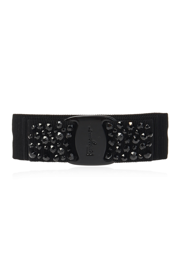 Black hair clip from FERRAGAMO. Crafted from ribbed fabric, this item features a bow, black Swarovski crystals and a metal logo-embossed detail in black.