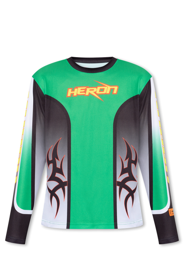 Green, black and white crewneck T-shirt from Heron Preston featuring a decorative graphic pattern, logo detailing and long sleeves.