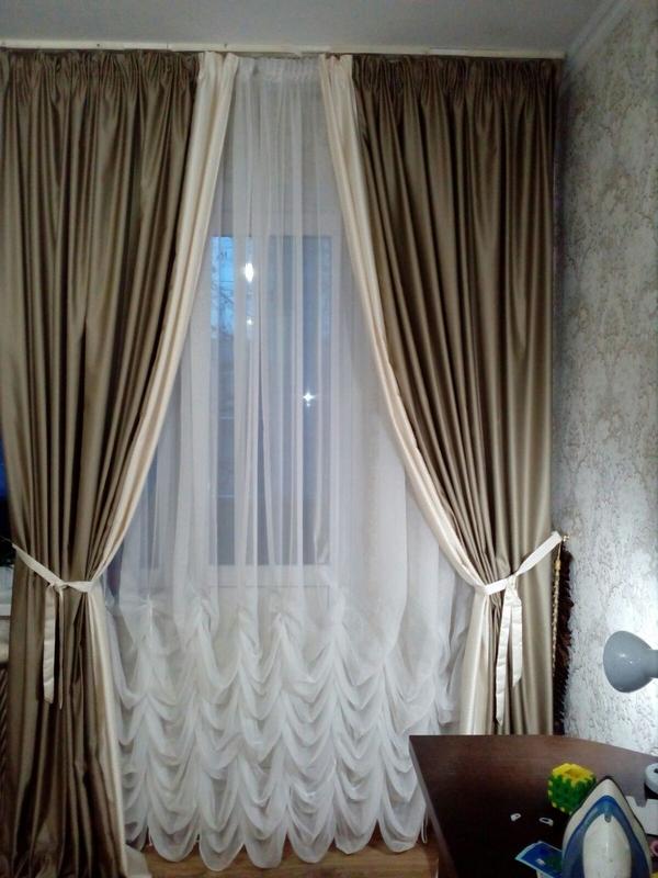 Безумно красивые нежные шторы с отделкой. Ткань похожа на атлас, но без блеска. Хорошо закрывает свет . Изнанка светлая. На фото ширина 1.80+1.80 = 3.60 ,но может меняться