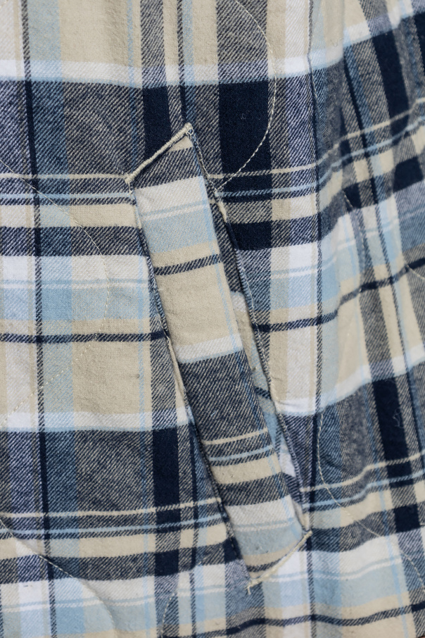 Navy blue, cream and white overshirt from Rag & Bone. Crafted from quilted cotton with a check motif, this style features snap closures, cream elbow patches, two slip pockets and long sleeves with buttons and snap closures on the cuffs.