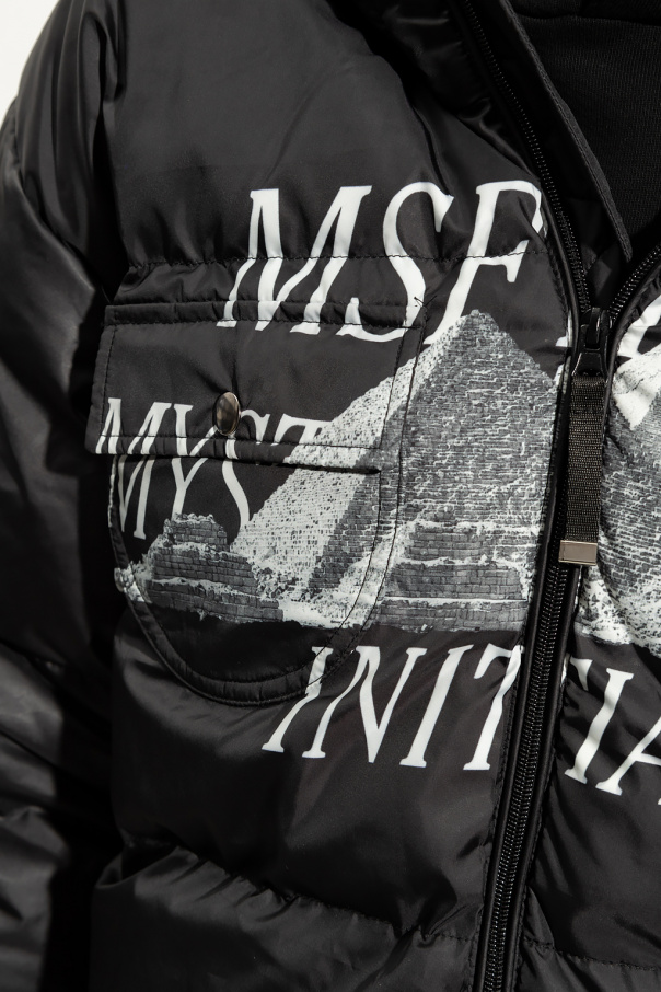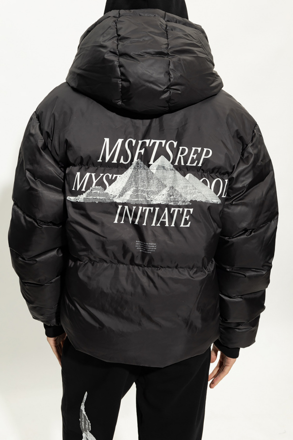Black insulated jacket from MSFTSrep. Fastened with a two-way zip, this garment features a drawstring hood, white and grey logo print, two front pockets, two snap-fastened back pockets, drawstring hood and long sleeves with ribbed cuffs.