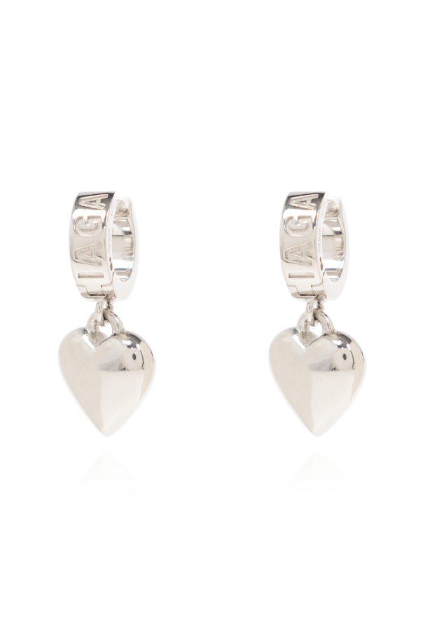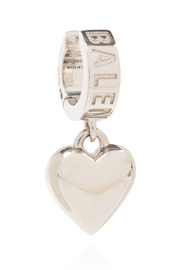 Silver earrings from Balenciaga. They showcase an engraved logo, heart pendants and snap closures.