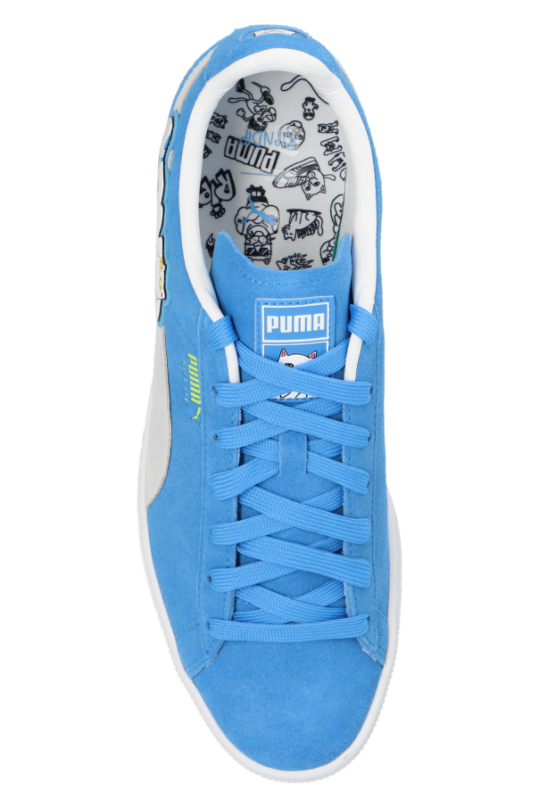 Blue and light grey ‘Regal’ sneakers from Puma x RIPNDIP. Made of suede, this lace-up pair is complete with multicolored patches, logo prints and a white rubber sole.