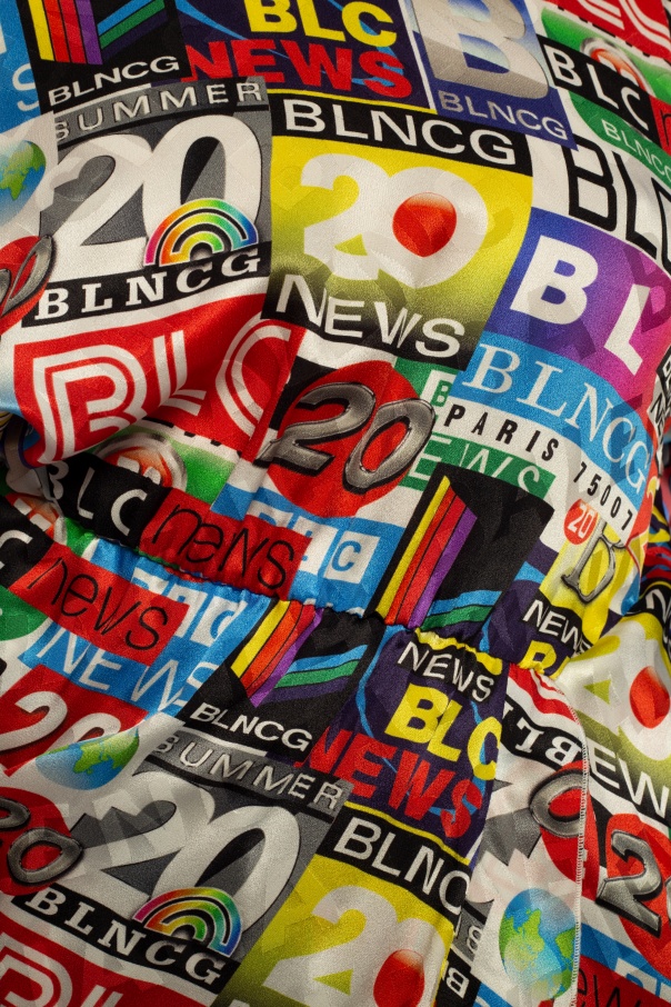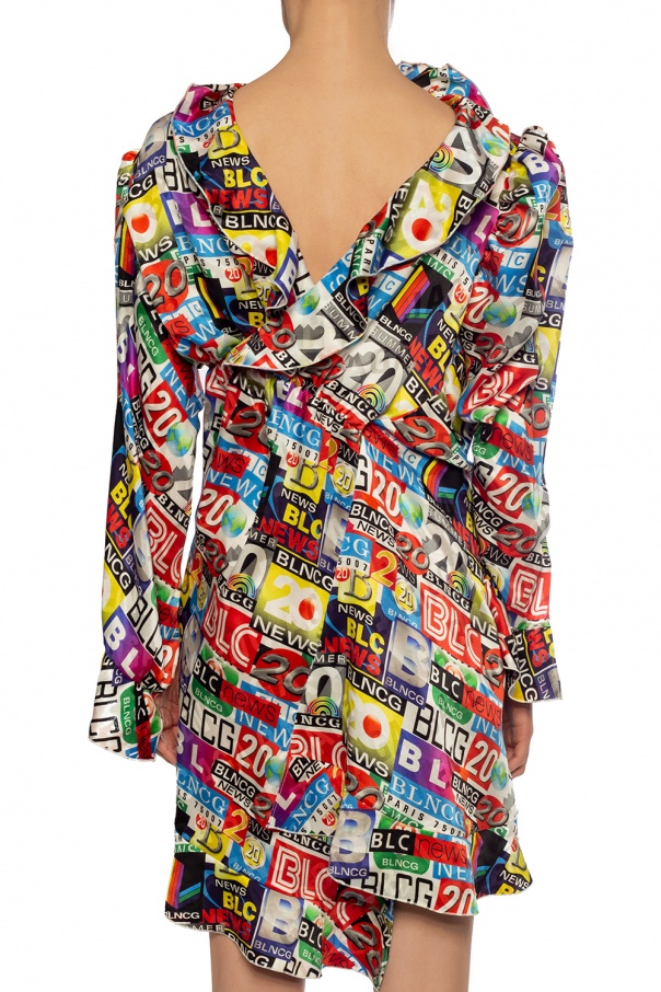 Multicoloured dress from Balenciaga. Made of cotton. Features printed colourful graphics and V-shaped neckline with ruffle trim.