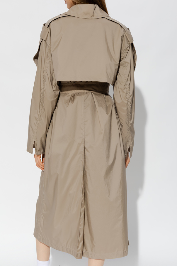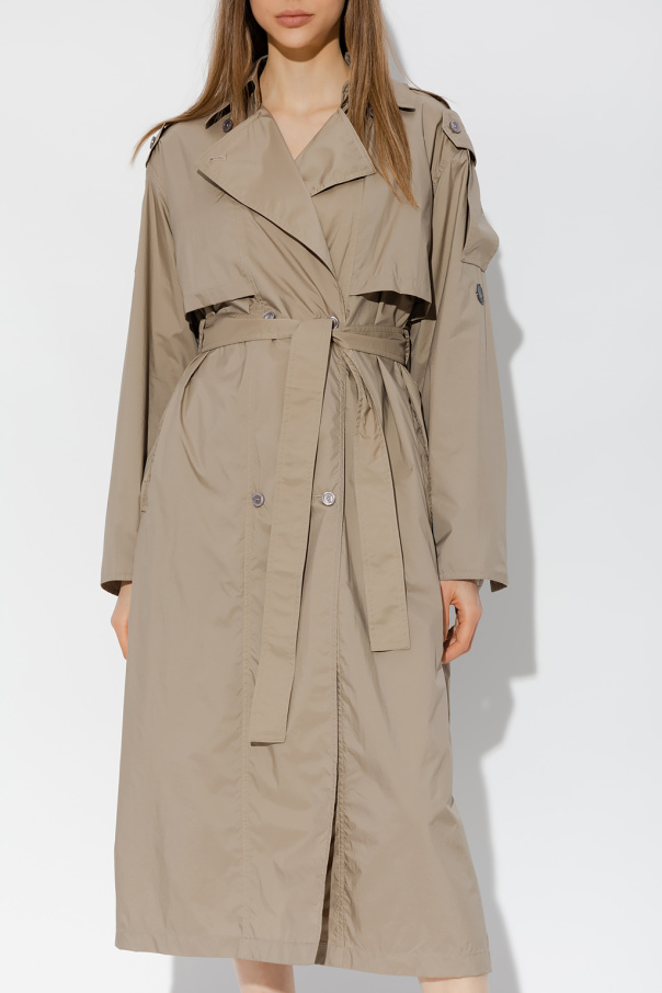 Greyish beige ‘Deva’ double-breasted trench coat from Moncler. Crafted from recycled longue saison, an ultra-lightweight, water-repellent nylon fabric, this design is complete with buttons, epaulettes, two front pockets, single rear vent and long sleeves with a logo patch.