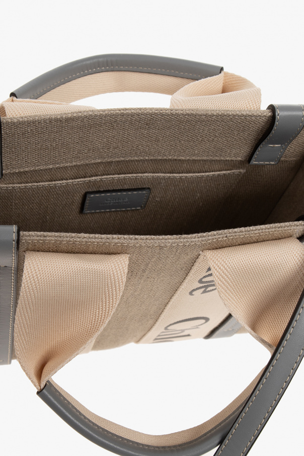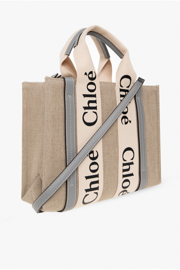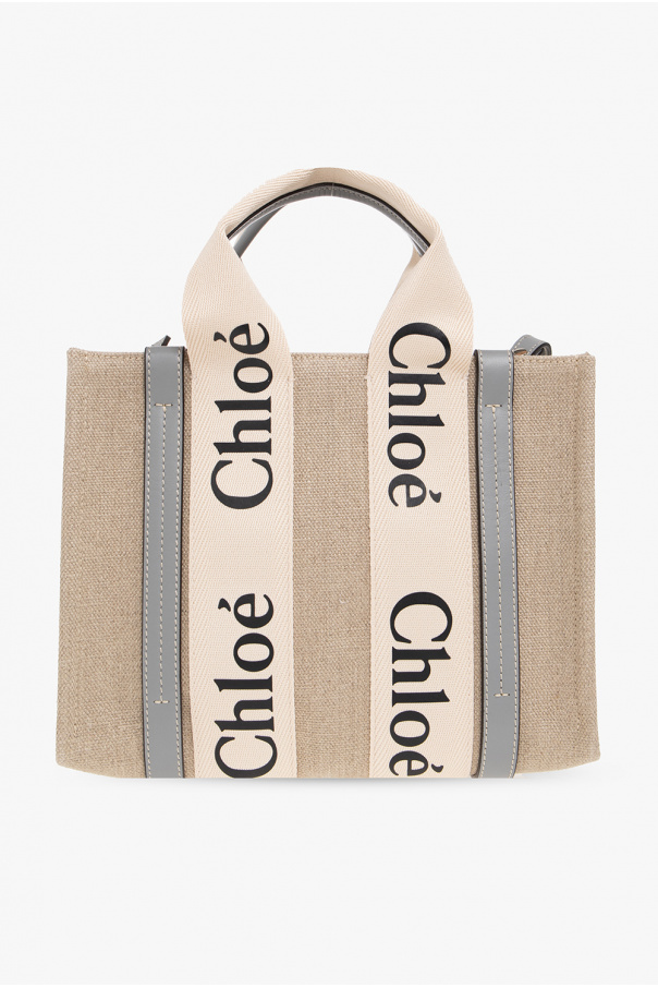 Greyish beige and cream ‘Woody Small’ shopper bag from Chloé. Crafted from linen canvas and trimmed with blue calf leather, this design features a black logo print, two half-round handles, a detachable and adjustable strap and one internal compartment with a slip pocket.