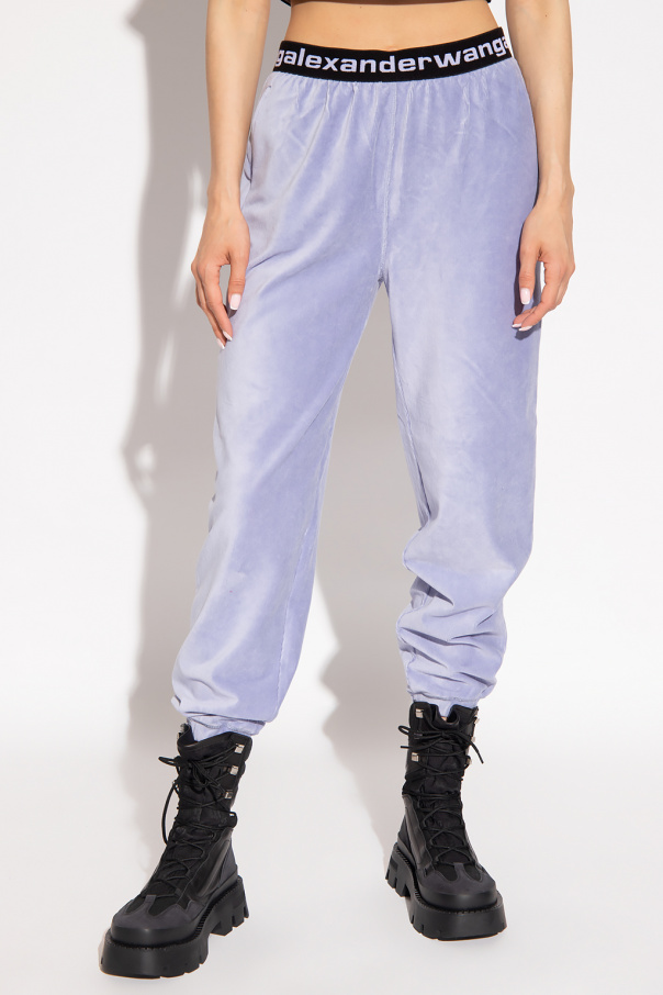 Blue corduroy sweatpants from T by Alexander Wang. This pair features a black waistband with a white logo, two slip pockets and elasticated cuffs.
